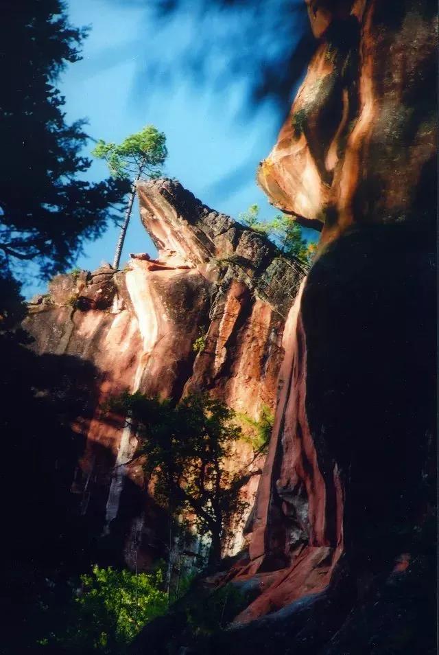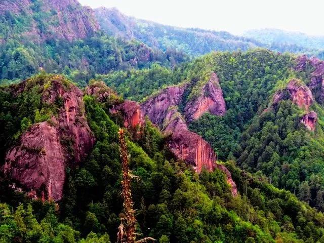 吉利吉是普米語(yǔ)“美麗的紅巖石”。入口處“滴水巖”兩側(cè)千仞絕壁,箐口無(wú)路可循,只能借助生長(zhǎng)在巖縫里的藤蔓攀援上一側(cè)山脊,才能緩步前行,越過(guò)近400米寬的滴水巖絕壁,猝忽一片紅染丹涂的奇峰異石,這些高大壯觀,輪廓分明,造型奇特,惟妙惟肖的紅石嶺谷縱橫,深溝巨箐,峽瀑跌水的分割下,構(gòu)成千峰萬(wàn)壑,處處絕壁的卡拉布丹霞奇觀。