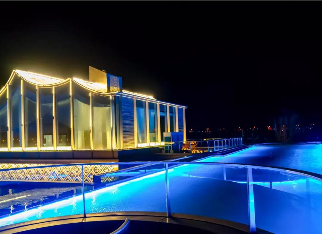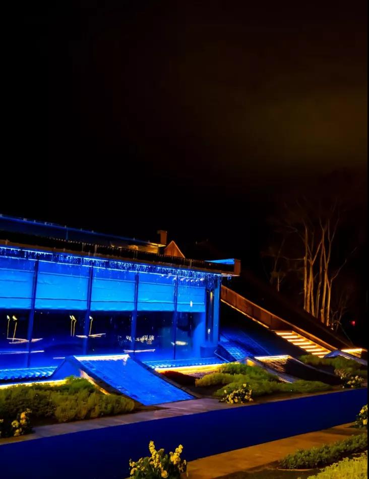 建筑輪廓被暖融融的橙色光包裹,十分耀目;一旁的水鏡沉浸在大片藍(lán)色中,藍(lán)、白、橙、黃光相互映射,你細(xì)細(xì)品味,越覺(jué)它的韻味濃厚。