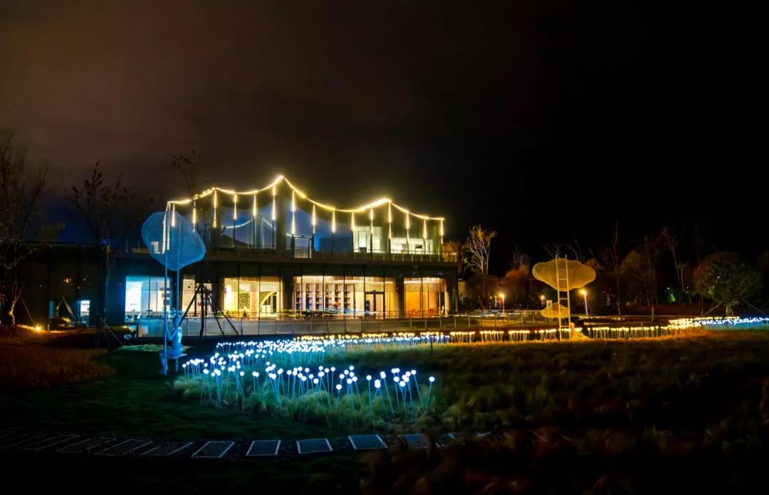 夕陽(yáng)遲暮,霞光輕灑身上,自然有趣,時(shí)間仿佛靜止一般,也跟著安靜下來(lái)。直到展示區(qū)主體的燈帶點(diǎn)亮,彩色的光影映在水中,破開(kāi)這片幽靜的夜色。