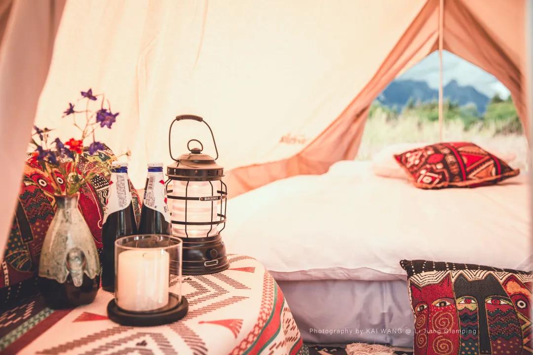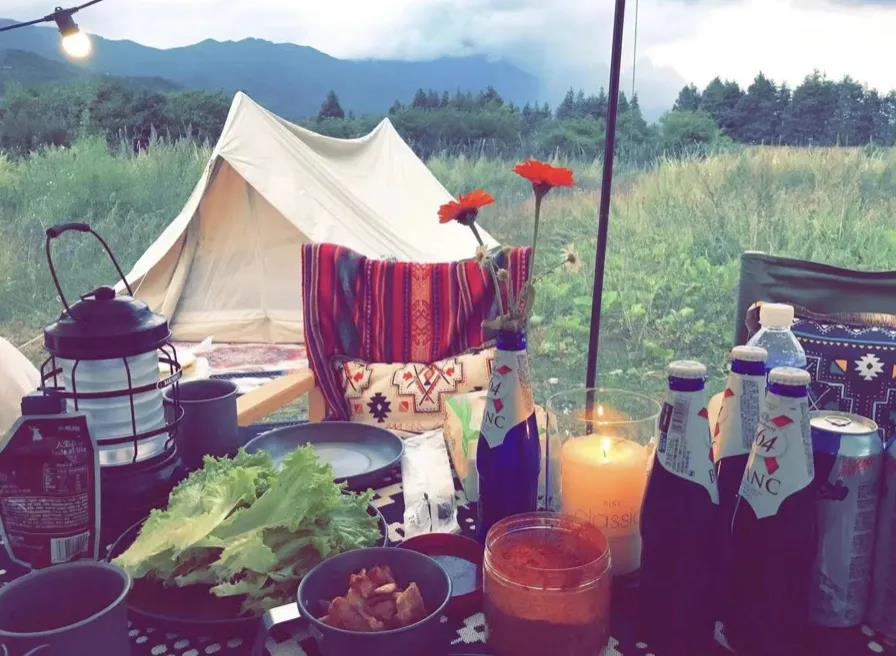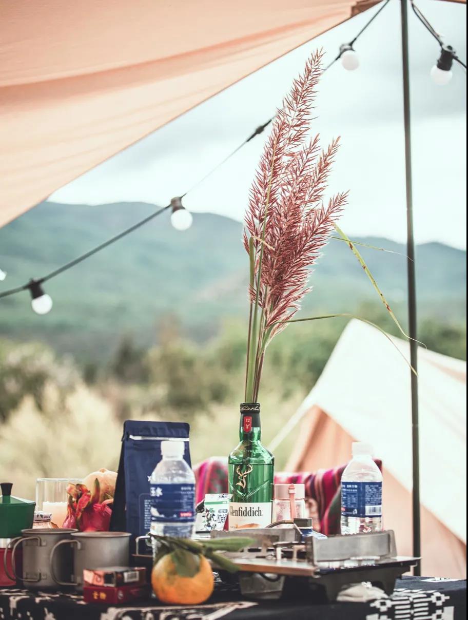 在群山中藏著的一片空地,周圍一圈圈狗尾草,幾頂帳篷放置其間。在草地上鋪一塊毯子,往上一坐就是舒適愜意的田園隱居生活。