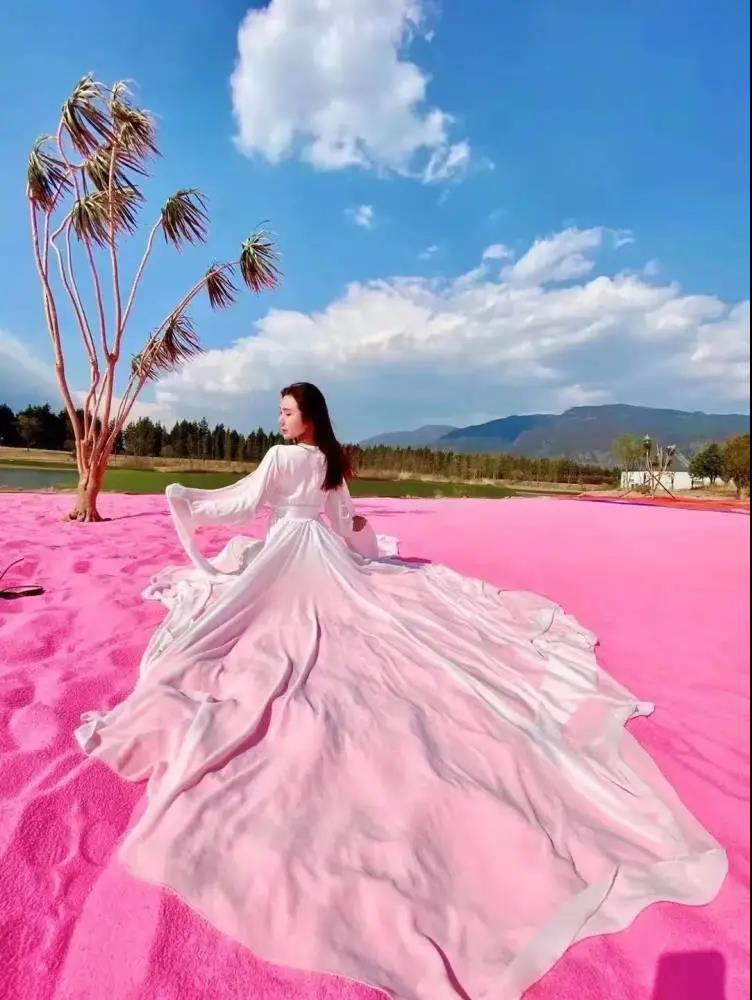 在粉紅的珊瑚泥沙里留下成雙的腳印