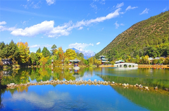 說來也奇怪,這條橋把黑龍?zhí)斗殖蓛蓚€池,照片左側的池水深且清澈,右邊的池水淺且微渾。當?shù)厥忻裥蓍e時間會在這里游玩喂魚,他們也都很自覺地只喂右邊池里的魚。我想麗江這么美跟當?shù)孛癖姷膼圩o也是有很大關系的吧。