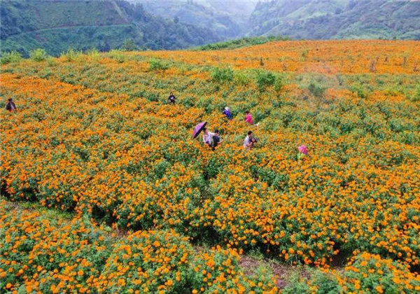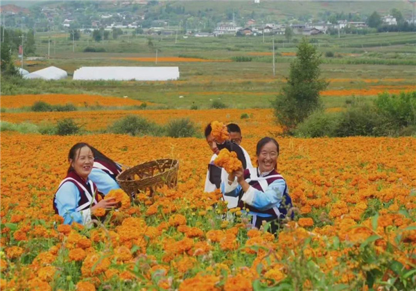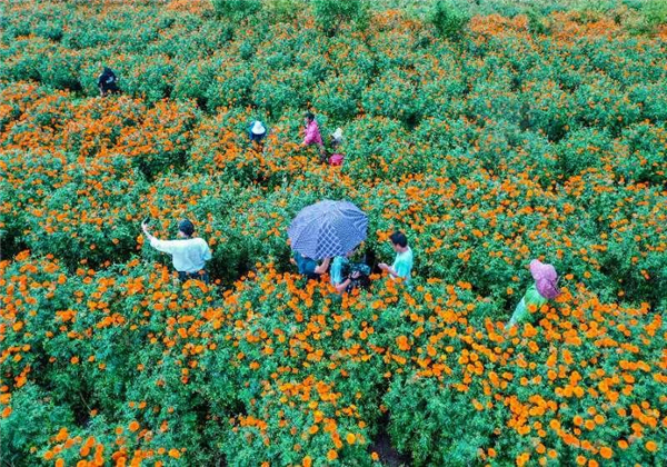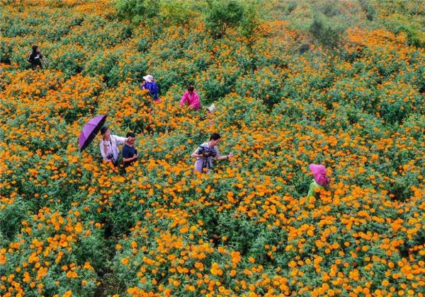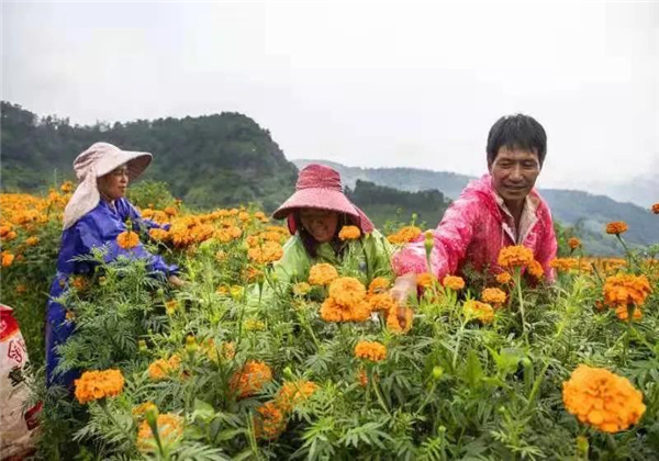 此時,萬壽菊進(jìn)入采摘季只見農(nóng)戶臉上洋溢著豐收的喜悅摘花、運(yùn)花來回忙觀賞花搖身一變成了“致富花”。