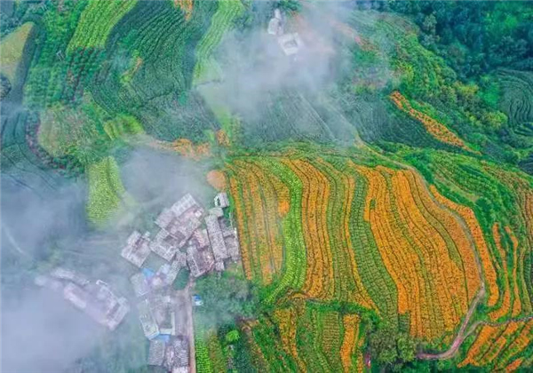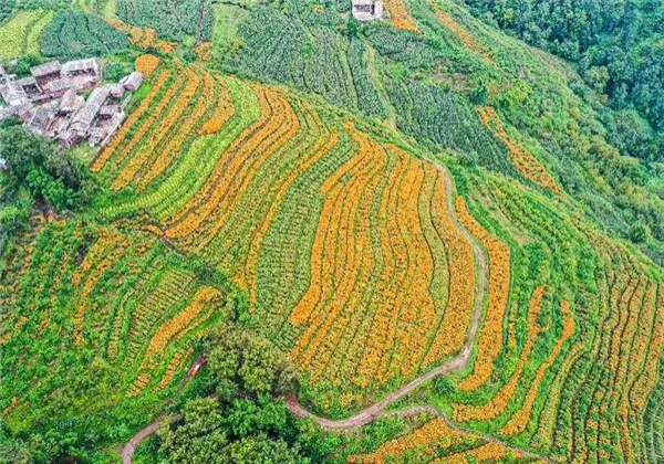 走進(jìn)維新村的田間地頭到處都是漫山遍野的橘黃色花簇錯落有致,連綿起伏成了鄉(xiāng)村田野上一道靚麗的風(fēng)景線。