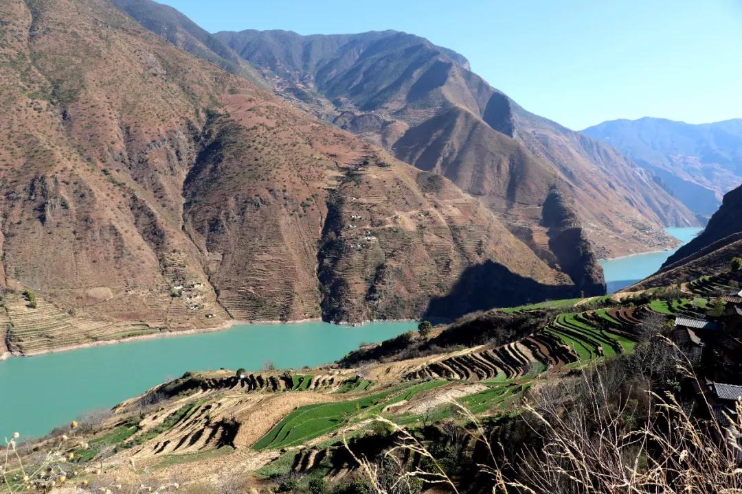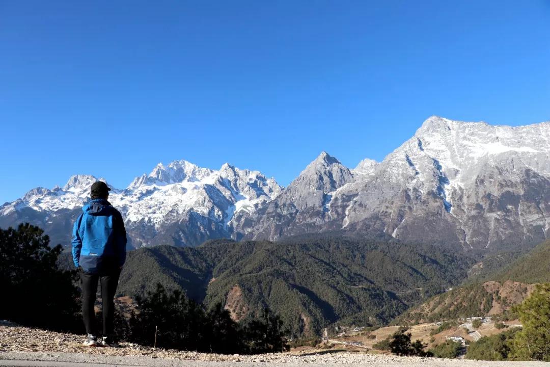 走到觀景臺上,看到一位頭上戴著納西族傳統(tǒng)的藍(lán)帽子的老太太,背著柴禾,健步如飛;還有村民在趕著滿載貨物的山地馬,一步一個腳印,嗒嗒嗒地從我面前走過。