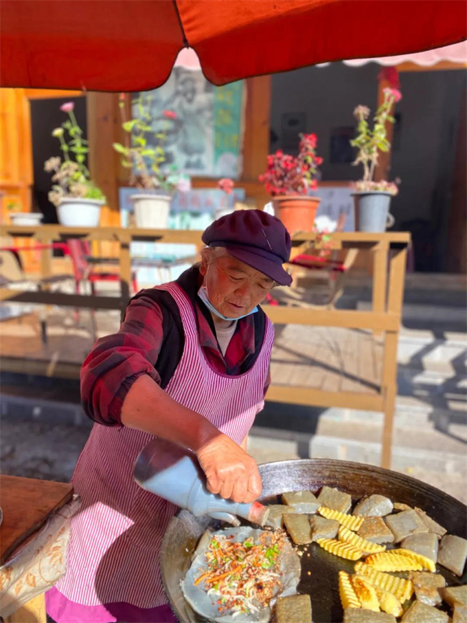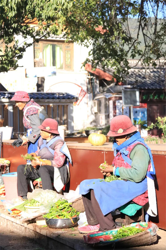 生活的模樣就在這里,在白沙生活的人們是那么的淳樸,街邊坐著賣菜的奶奶,“買一把菜走嘛,都是自己家菜地里種的,沒有一點(diǎn)農(nóng)藥?!彼蚪?jīng)過的路人介紹自己的蔬菜,但是不慌不忙,因?yàn)樗静恢卑巡速u完。伴著陽光,這幅畫面就是人間的煙火氣。到了白沙,吃上一碗雞豆涼粉,方不虛此行。街頭賣涼粉的奶奶嬢嬢們,熱情地招呼每一個(gè)光顧的客人,味道正、分量足,是她們永遠(yuǎn)不變的招牌。慢慢悠悠地走在街邊,你會(huì)看到幾個(gè)難得清閑的納西嬢嬢站在街邊嘮著家常,麗江的陽光讓她們的皮膚有些黝黑,可是面龐總是帶著生活的朝氣,或許是白沙這暖暖的生活氣息,滋養(yǎng)了這里淳樸的人們。