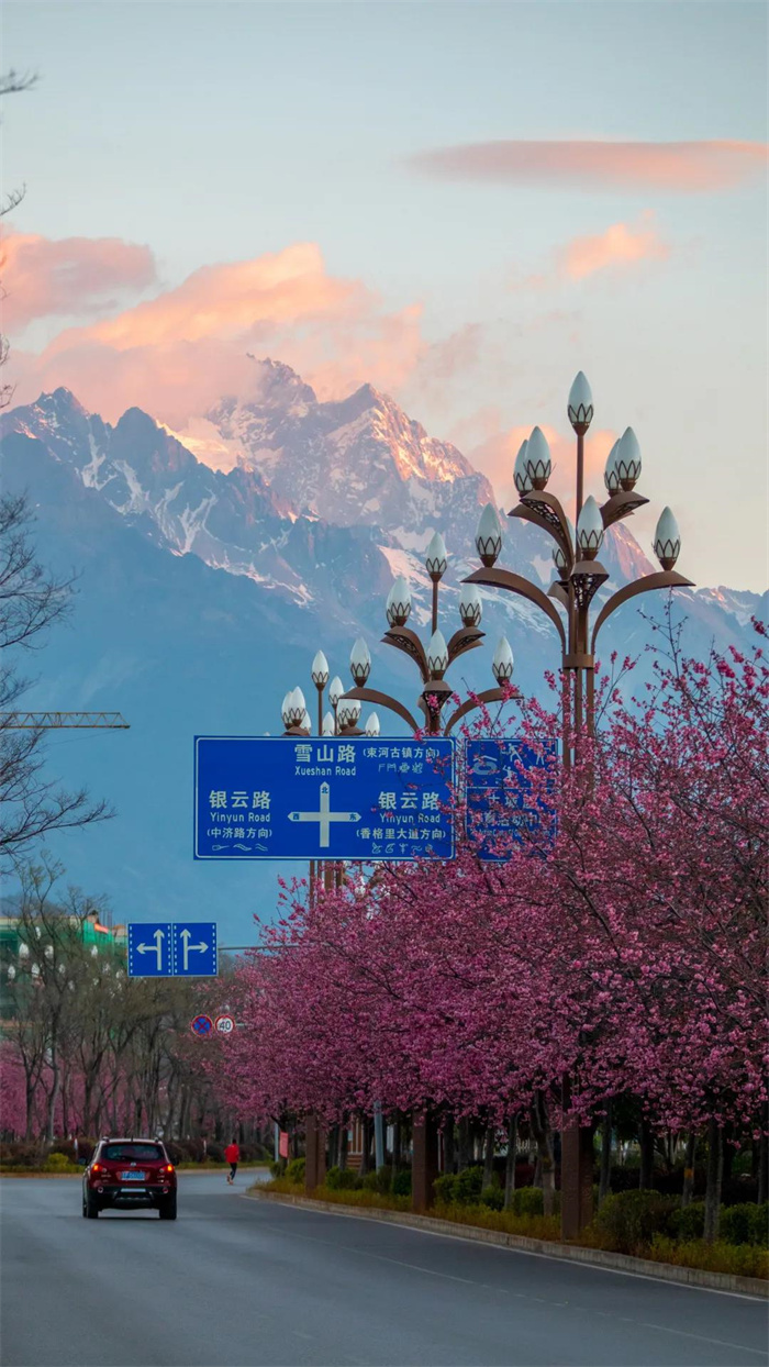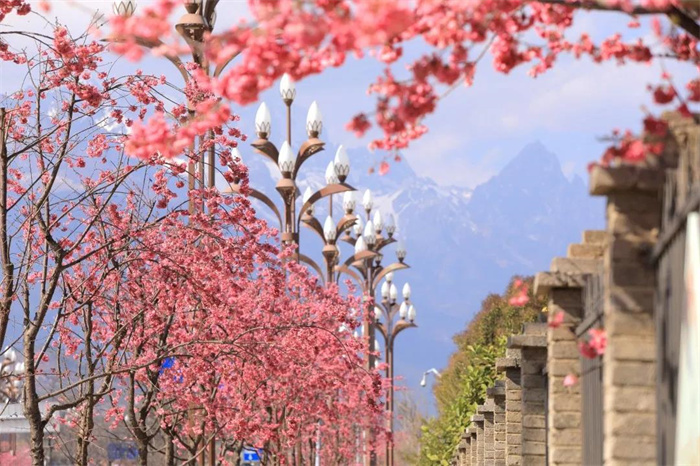 4月份正值春季,春天的麗江,萬物復(fù)蘇,雪山下的櫻花也如期而至了。每年的3-4月份,這里的街道便被一片粉紅給包圍,一朵朵盛開的櫻花在和煦的陽光下隨春風(fēng)飄動著,偶有花瓣飄落在地面……