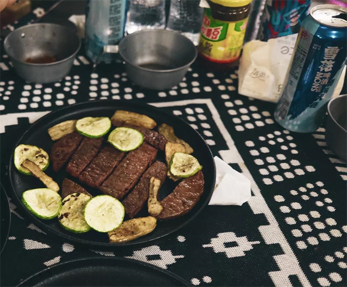 伙伴們展示自己手藝的時候也到了。隨著鍋碗瓢盆“哐啷”交錯的聲響,營地中開始彌漫著食材的香味。在營地中晚餐時,太陽日落西斜,一點(diǎn)點(diǎn)消失在夜空中,營地亮起了星星點(diǎn)點(diǎn)的燈光。