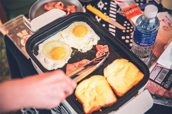 “可以來吃早餐啦!”,向?qū)г趲づ裢庀蛭覀兒魡?。煎到剛剛好雞蛋,蛋白熟了,蛋黃還在是流動的液體,再加上培根和烤焦了的面包,真是令人心情愉悅的健康早餐。