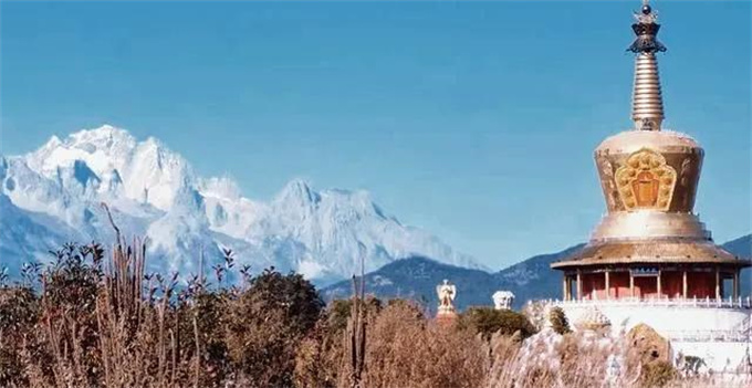 在麗江古城的外圍蛇山之上還有一座藏傳佛教-麗江大金塔,巍峨的矗立山巔。金閃閃的塔尖與玉龍雪山相得益彰。傳統(tǒng)的藏傳佛寺建筑風格有著濃郁的東南亞風情。始建于唐朝的麗江大金塔已有千年歷史。是麗江高原之上的悠久人文風景。