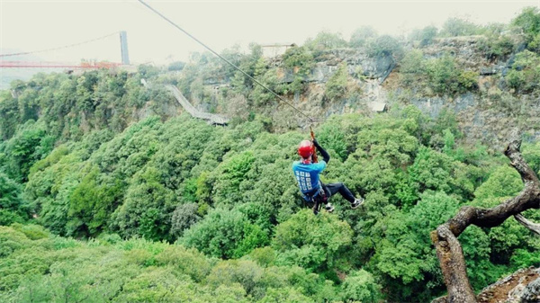 溜索結(jié)束,還有一小段階梯,爬完后整個(gè)攀巖活動(dòng)結(jié)束。放開自己,勇往直前,是挑戰(zhàn)攀巖應(yīng)該有的狀態(tài)。原本以為自己無能為力,但克服困難闖關(guān)成功之后,你將獲得全身心的一個(gè)放松,是勞逸結(jié)合非常好的選擇。除了心理上的獲得,另外一個(gè)收獲則是美景。正所謂“無限風(fēng)光在險(xiǎn)峰”,藍(lán)天白云、峽谷秘境盡收眼底。