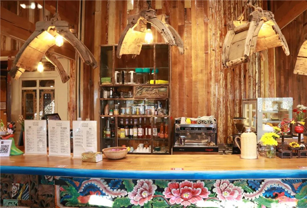 店內(nèi)的裝修是簡單大氣的木質(zhì)風,但又不失細節(jié),一個燈罩可能是酥油罐的蓋子,墻上是裝飾是一扇扇的木窗拼接在一起。