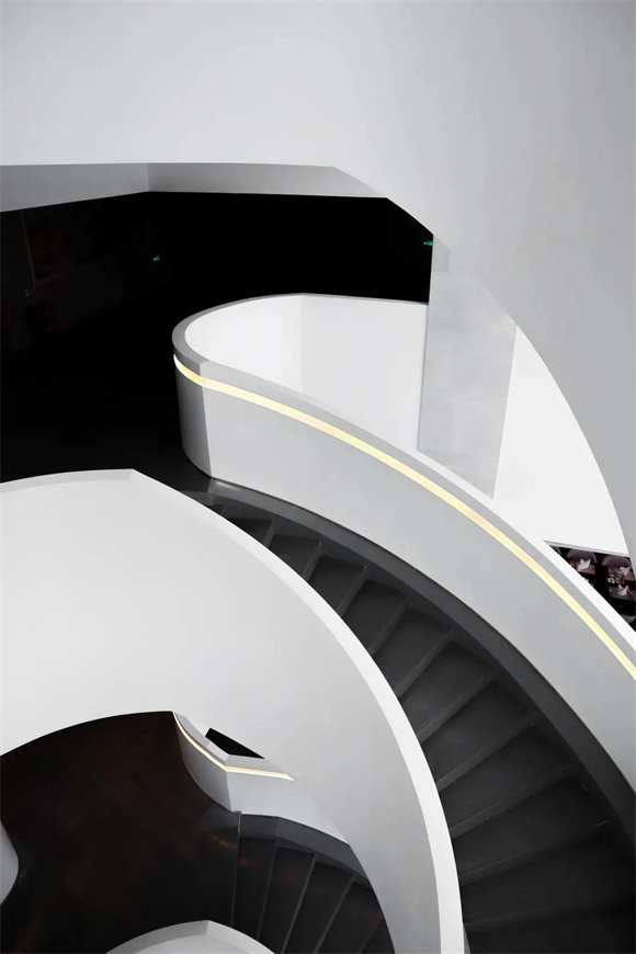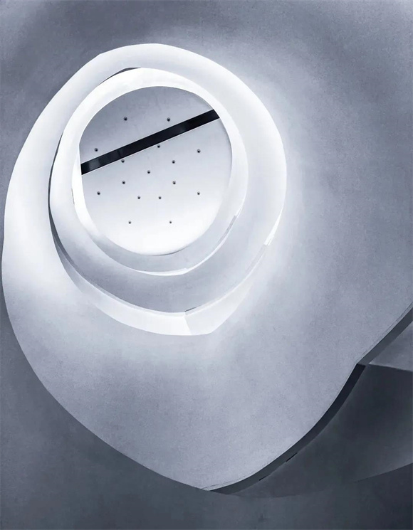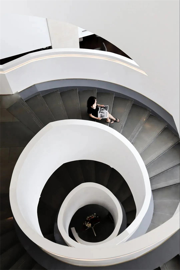 酒店內(nèi)部尤為吸睛的當屬旋轉(zhuǎn)樓梯,純白的外衣散發(fā)著云貝般的光澤,溫暖的燈帶順著樓梯延展,優(yōu)雅而頗具未來感。由下仰望,如云朵慢慢升騰;自上俯瞰,又如花朵悄然綻放,隨手一拍都是INS風爆棚的美照,儼然已成為酒店的網(wǎng)紅打卡點。