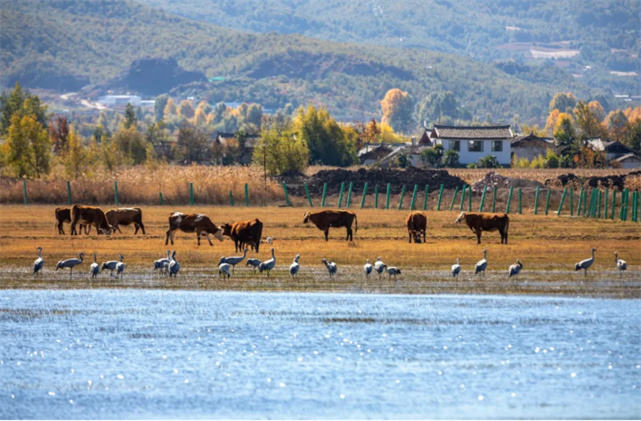 回到拉市海管護(hù)局,門前的濕地邊也有一群灰鶴。它們在水邊一字排開,與身邊的老牛若即若離,互不干擾,和睦相處,真是一幅和諧優(yōu)美的田園畫卷。