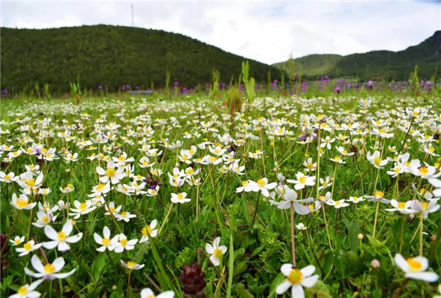 五顏六色的小花整片整片地開放在這片高山草甸上,就像一塊美麗的五彩織錦,花開傾城。