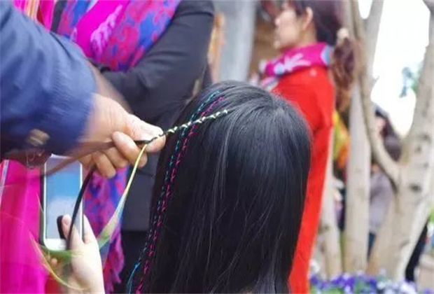 找當(dāng)?shù)厝司幉兽p兒。街上經(jīng)常有攥著一把彩繩的大姐,席地而坐,不出2-3分鐘,麗江特色十足的彩辮兒就出爐咯!