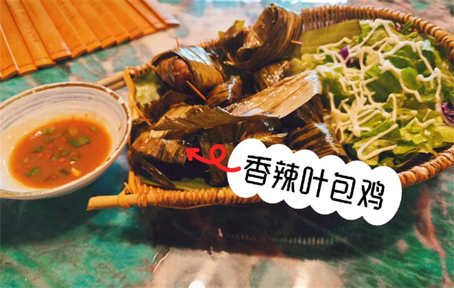 用葉子包裹起來(lái),葉子是脆脆的,光吃雞肉可能有點(diǎn)膩,蘸點(diǎn)調(diào)料很清爽。