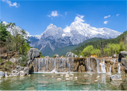 藍月谷景區(qū)藍即是以前的“白水河”景區(qū),位于玉龍雪山東麓甘海子以北、云杉坪南側(cè)的山谷之中。源自雪山冰川的萬古冰雪消融之后順著峭壁流淌而下,不斷