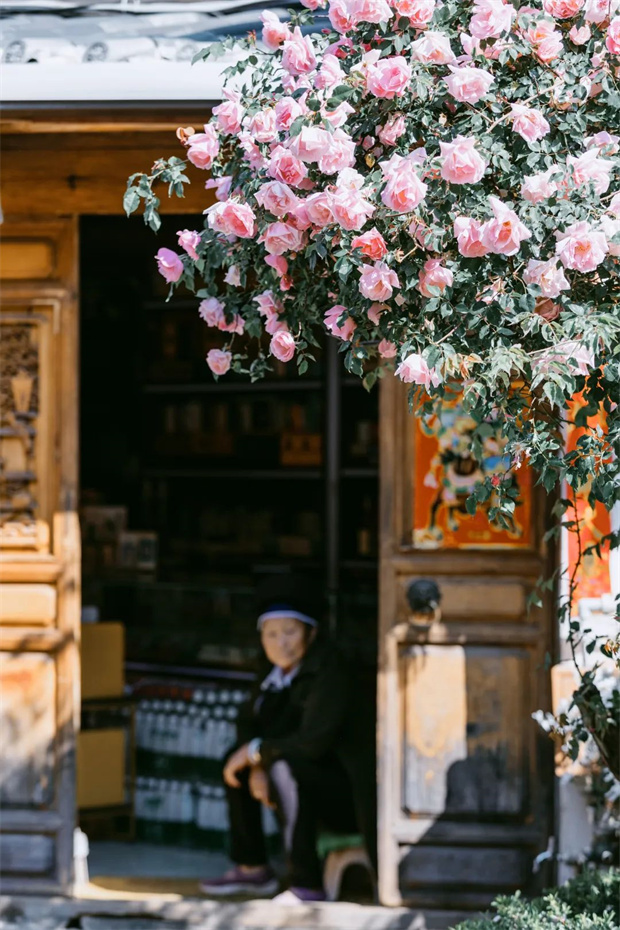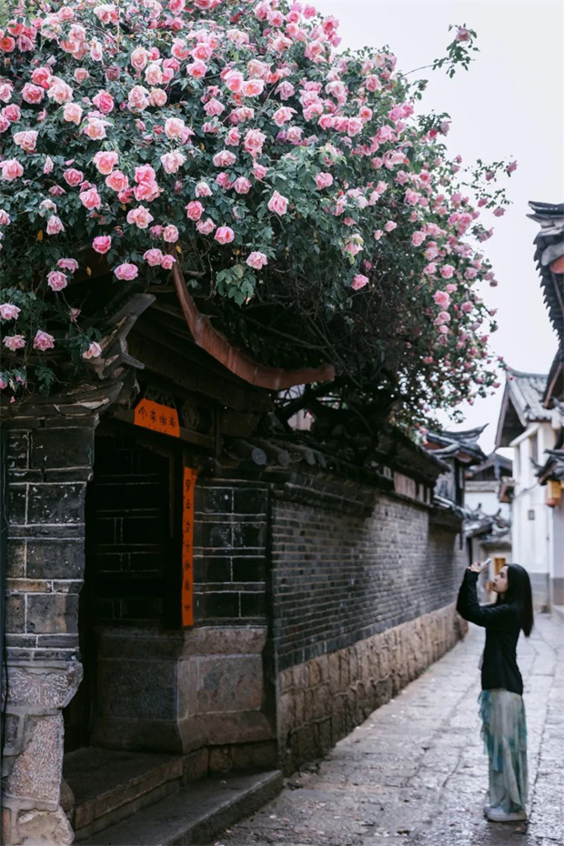 “麗江之路”的美,不僅在于它的花朵,更在于它與麗江古城的相得益彰。在古城的很多角落,你都能找到它的身影。它