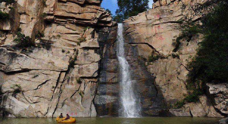 落雁潭和通天瀑:通天瀑垂直陡峭,壁如刀削,五十多米高的瀑布仿佛從天而降,煙霞升騰,彌漫山谷,冷氣撲面。落雁潭是通天瀑沖擊而成,潭闊水深,水面100多平方米,水深處有3-4米,此處地勢較為開闊,山峰環(huán)抱,山清水秀,河灘卵石縱橫,山花野草茂盛。每當(dāng)初春或冬臨時,大雁到此棲身落腳,故有“落雁潭”之稱。在落雁潭北側(cè),通往通天瀑頂?shù)亩钙轮虚g,有一15米深的石洞,洞內(nèi)可容百人,從入口到出口修成了一條38級臺階的通道,人們又稱之為“通天洞”,攀過通天洞,登上5米長的“天橋”,往下俯視,落雁潭和通天瀑的全景盡收眼底。