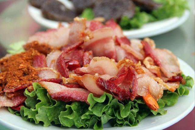 納西烤肉,它的燒烤方式非常具有地方特點(diǎn)。它是用一個形似水缸的烤爐,中間部分堆滿碳火,烤爐的周圍用鐵絲拴著一圈掛肉的鉤子,腌制好的肉就掛在鐵絲上,只是看著就讓人口水四溢。它的主料則是由本地豬的五花肉切到適中的厚度烤熟。這樣烤出的豬肉,豬皮金黃松脆,肥而不膩,瘦而不柴,口感松脆,蘸著當(dāng)?shù)氐睦苯贩?,上面放著油炸的薄荷,吃起來那叫一個夠味。麗江幾乎各個飯店小餐館都可以做,而且做法也一致。