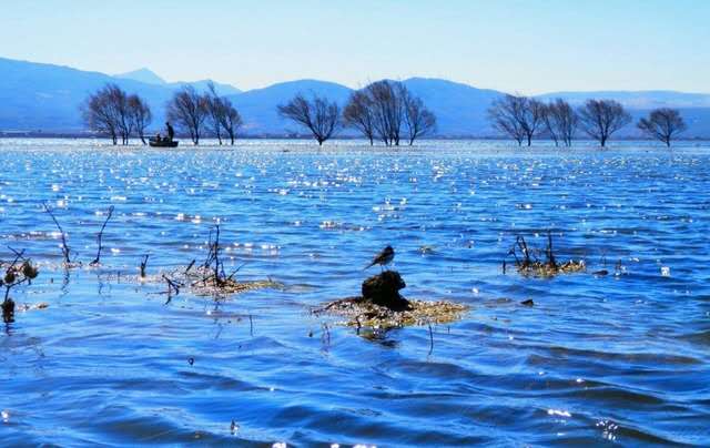 程海的藍鑲嵌在山間的綠中