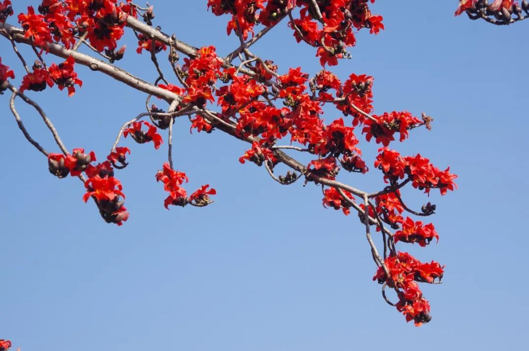 走進(jìn)春天的華坪,木棉并不難找,在街頭巷尾,在橋邊水畔,在田塍籬角,看見(jiàn)些高高大大、沒(méi)幾片葉子,又滿枝頭紅紅火火的喬木,這就是開(kāi)花的木棉了。