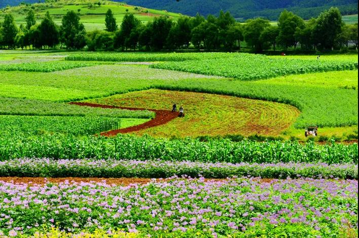 太安的洋芋花分別是:白色、粉色、紫色,3個不同的色彩,一朵朵的小花,就像一個情竇初開的少女,羞澀惹人愛。哈哈,雖然你吃過土豆,但是你有見過如此大片三色彩的花海嗎?一行人漫步在色彩斑斕的三色世界,走在花間小道,隨處可見的游客,在田間嬉戲拍照,輕輕撫摸花枝,俯下身細聞洋芋花粉的獨特味道,香氣撲鼻。站在小山峰俯瞰整個的洋芋花海,藍天白云的天,和五顏六色的花海?;ê吞炜眨瑑煞N鮮明的顏色,搭配在一起,讓眼前的景變成了一張美麗的明信片。